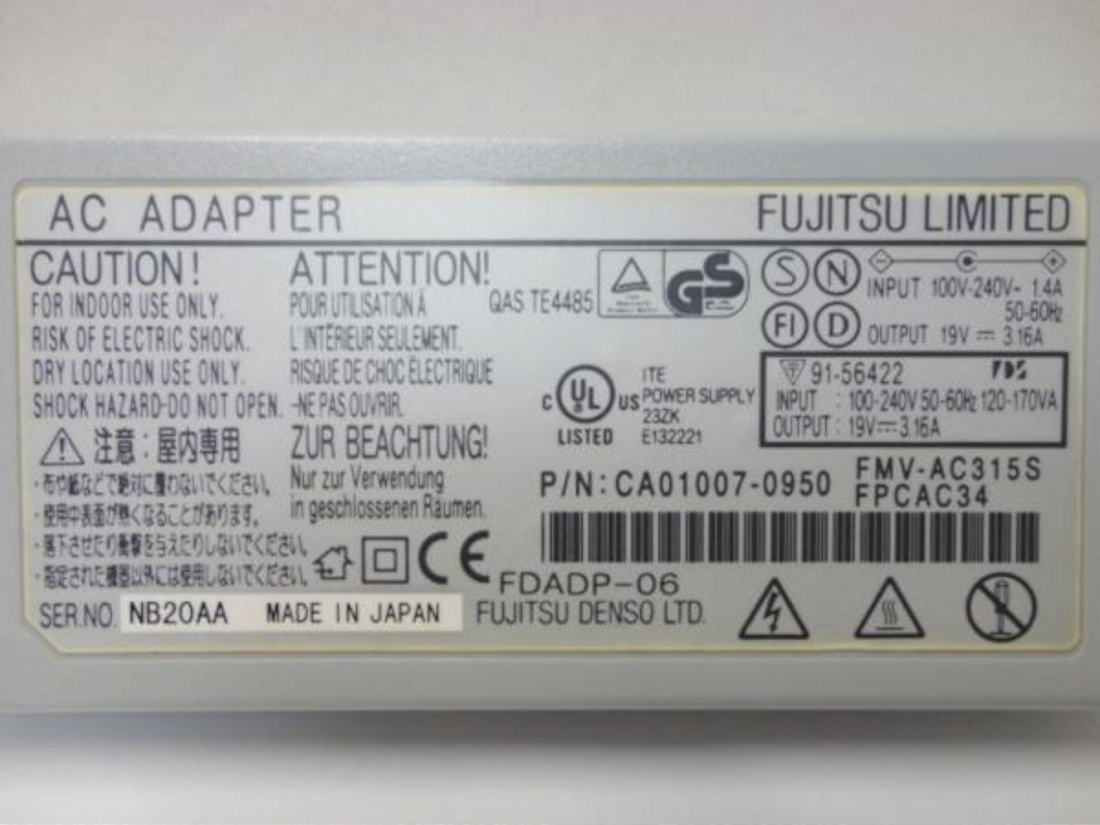 Genuine Fujitsu Limited LIGHT GRAY Laptop AC Adapter Power Supply CA01007-0860