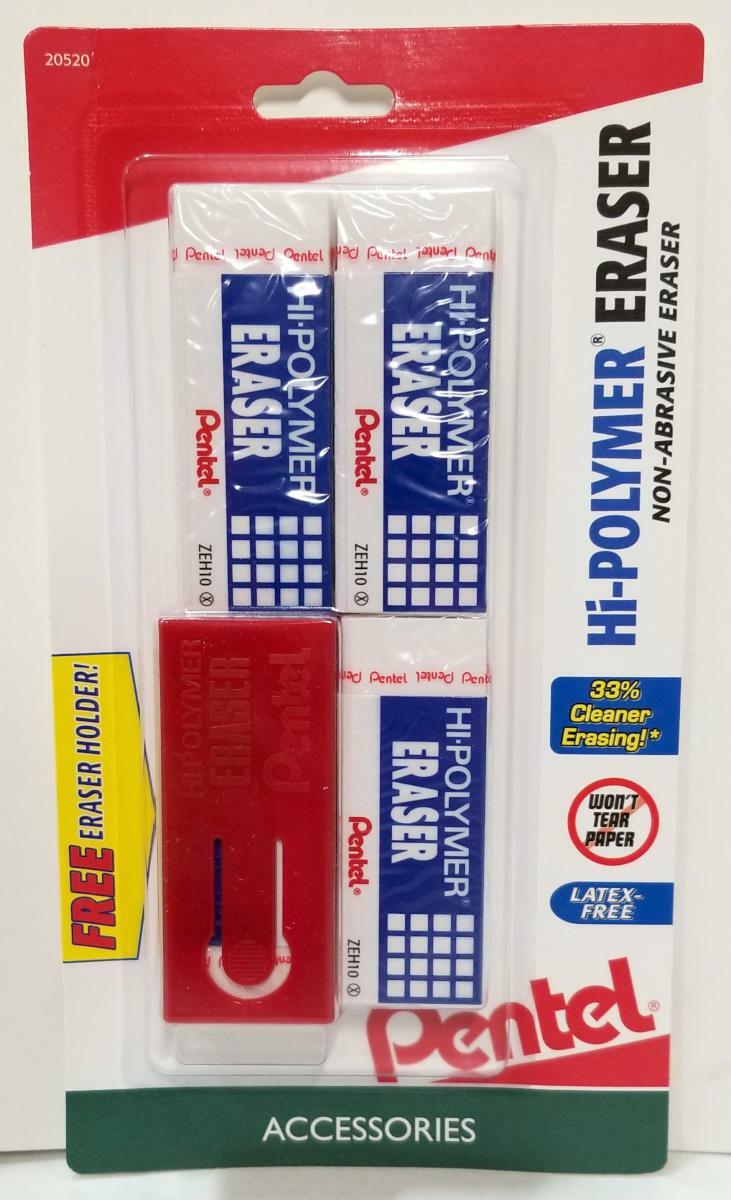 NEW Pentel Hi-Polymer Non-Abrasive White Block Eraser 4-PACK + Holder ZEH10