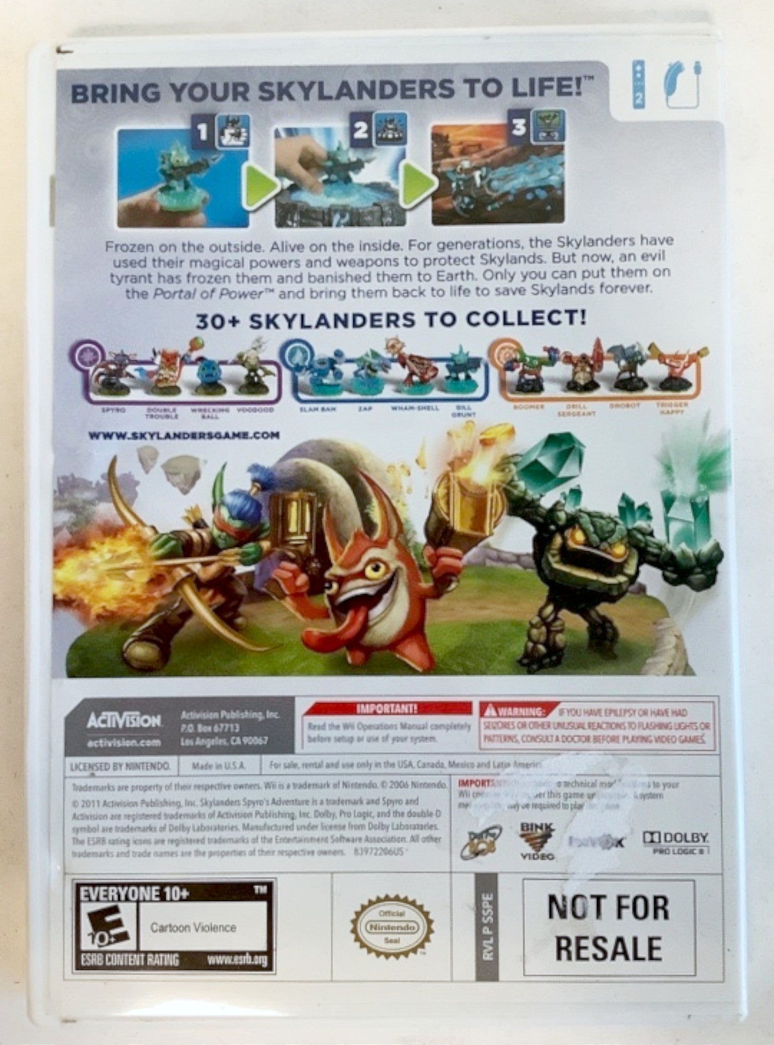 Skylanders Spyro's Adventure is an Action-Adventure game spin-off from the Spyro series designed for younger players that unlocks a whole new game universe while incorporating a unique gameplay mechanic utilizing more than 30 physical action figures that synch with consoles creating in-game character representations. The first release in the Skylander series, Skylanders Spyro's Adventure Starter Pack contains three action figures, an exclusive game peripheral as well as other items. Action figures are compatible with all versions of the game. The game features co-op and competitive multiplayer, mini-games and more.